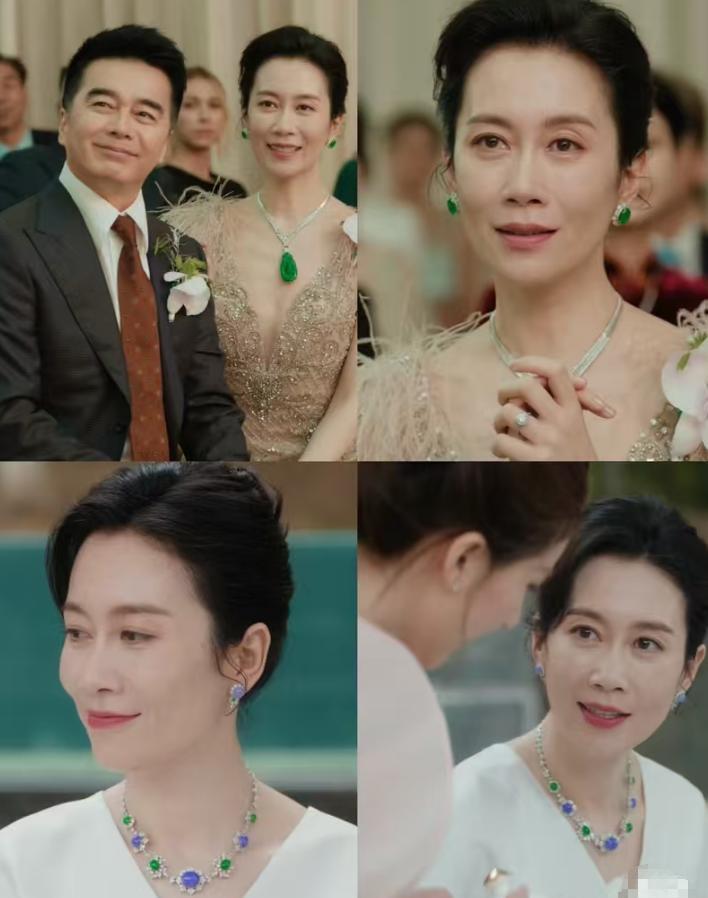 先说沈母(温峥嵘饰)的贵妇标配,不是满身 logo,而是三套不同的“帝王绿翡翠”。